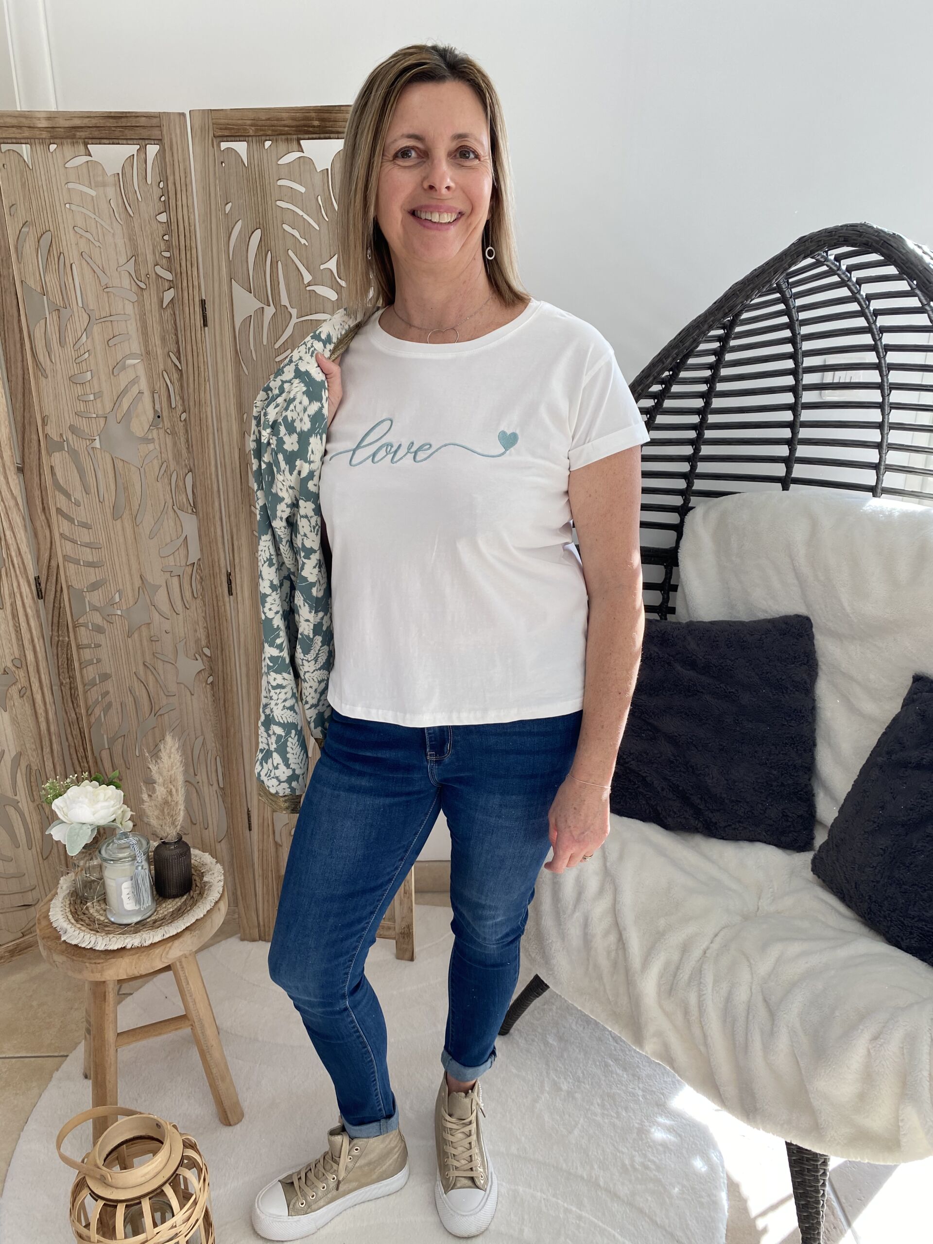 T-Shirt Blanc – Brodé LOVE en Vert – Manches courtes – Col rond – Composition 100% coton